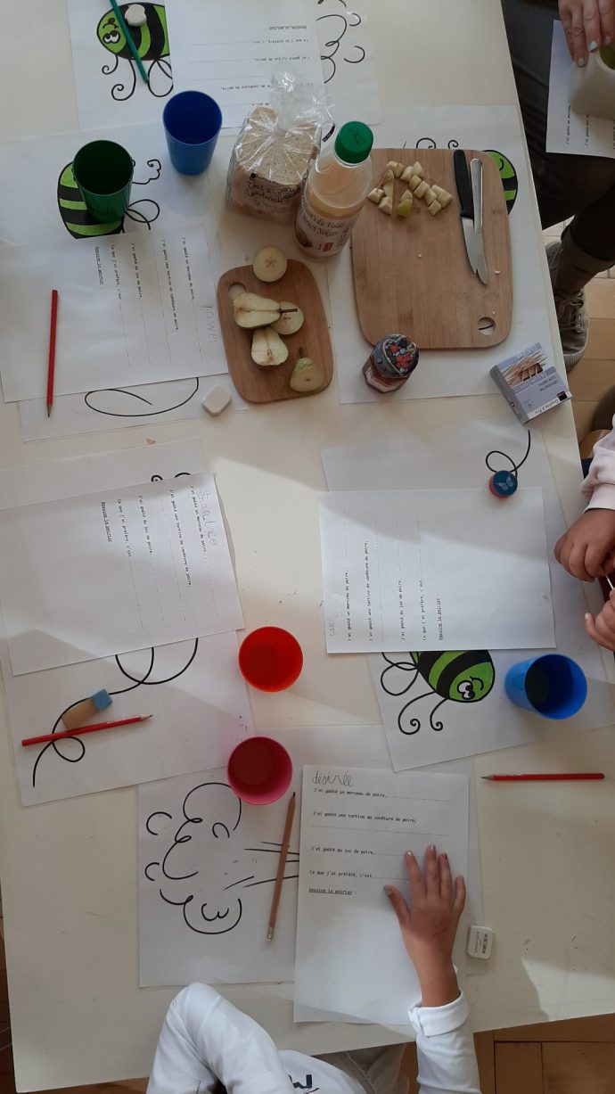 On a chanté. Martine a fait un gâteau à la poire. On a goûté du jus de poire. On a goûté de la confiture de poires.