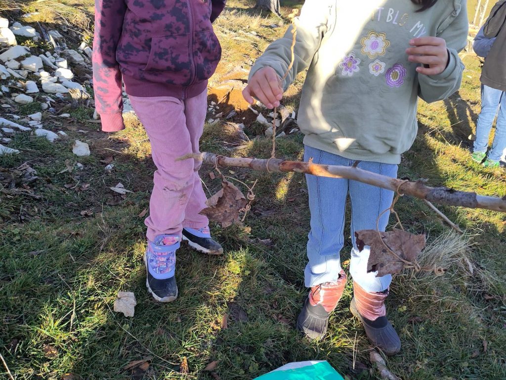 En définitive, la recherche des éléments du mobile, celle du centre de gravité, des équilibres avec les éléments du mobile se sont faites avec une grande intensité parce que le but était clair : l’équilibre final sur la corde. À part la ficelle légèrement rigidifiée pour éviter les nœuds, aucun autre matériel n’a été nécessaire. Nous avons cependant eu de la chance avec le temps, car accrocher des éléments sur une branche avec les doigts dans un froid vif aurait été problématique.