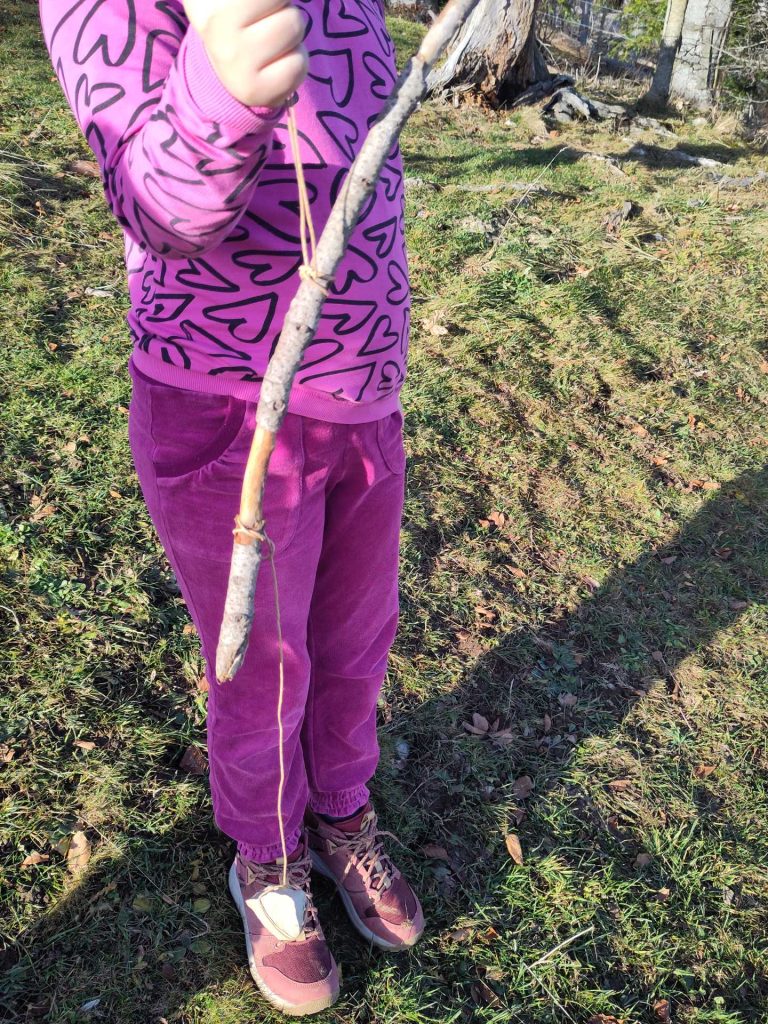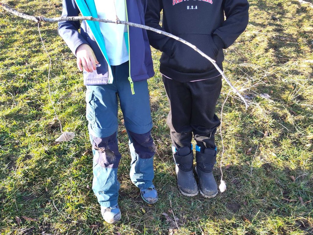 Ensuite, la recherche du point d’équilibre de la branche seule ne fut pas simple pour les élèves. Pas parce qu’ils ne comprenaient pas cette notion, non parce qu’ils ne pouvaient le situer, ce qu’ils firent très bien en posant la branche sur l’un de leur doigt, mais parce qu’ils devaient y accrocher le fil de suspension principal. Pour éviter d’avoir à faire des nœuds difficiles, ils avaient à leur disposition une ficelle au milieu de laquelle se trouvait un petit fil métallique rigide mais facilement pliable. En tordant ce lien, ils ont pu réaliser des boucles qu’ils pouvaient coulisser pour trouver le centre de gravité. Mais, celui-ci déterminé, bloquer le nœud à l’endroit précis de celui-ci a été difficile et il a fallu les aider.