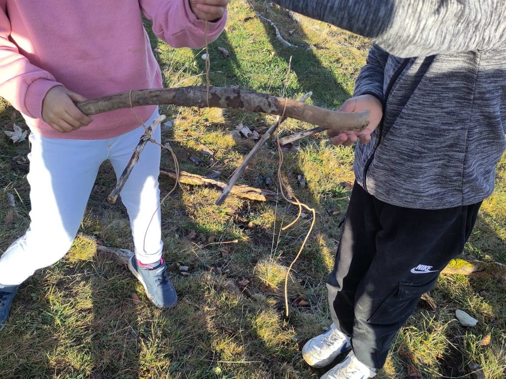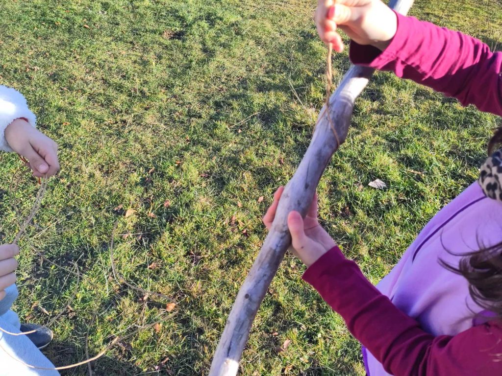 Un groupe n’a pas immédiatement compris ce qu’il fallait faire et à bloqué sa branche sous des pierres pour qu’elle ne bouge pas, au lieu de la suspendre. En voyant les autres, ils ont spontanément repris leur travail et réalisé l’équilibre de la branche.
