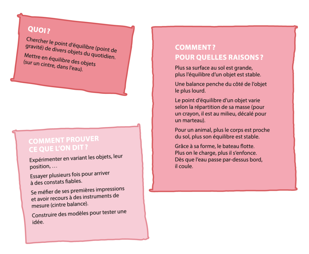Une partie des points évoqués sur l’image ci-dessus n’a pas été réalisé. Mais les notions de position du point de gravité par rapport au sol et celle de position du centre de gravité d’un bateau, seront reprises dans un atelier où l’eau pourra être présente.