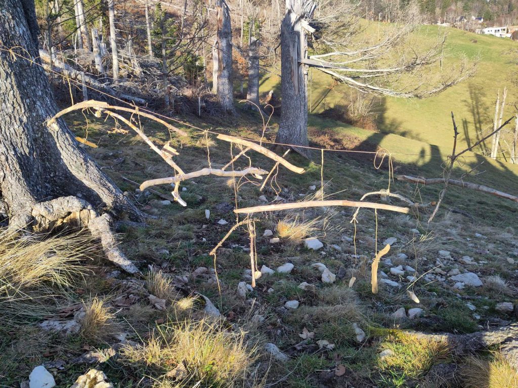 Trouver une branche d’arbre la plus droite possible, assez solide, autant que possible dépourvue de branches latérales, ne fut pas un problème. En effet, la forêt mise à mal par une tempête, en regorgeait.