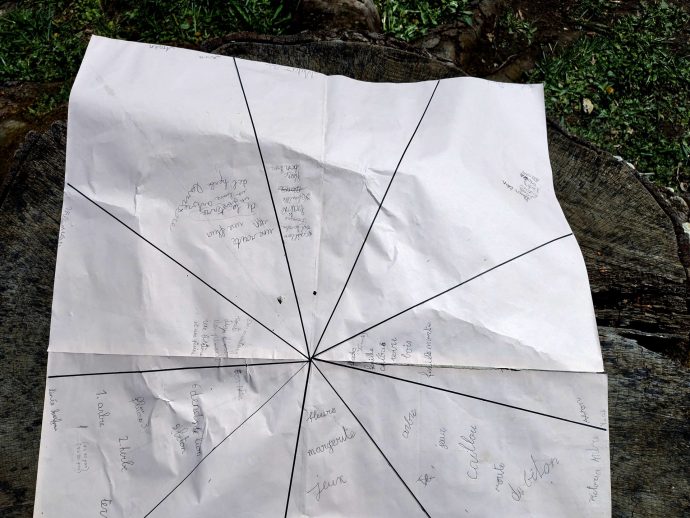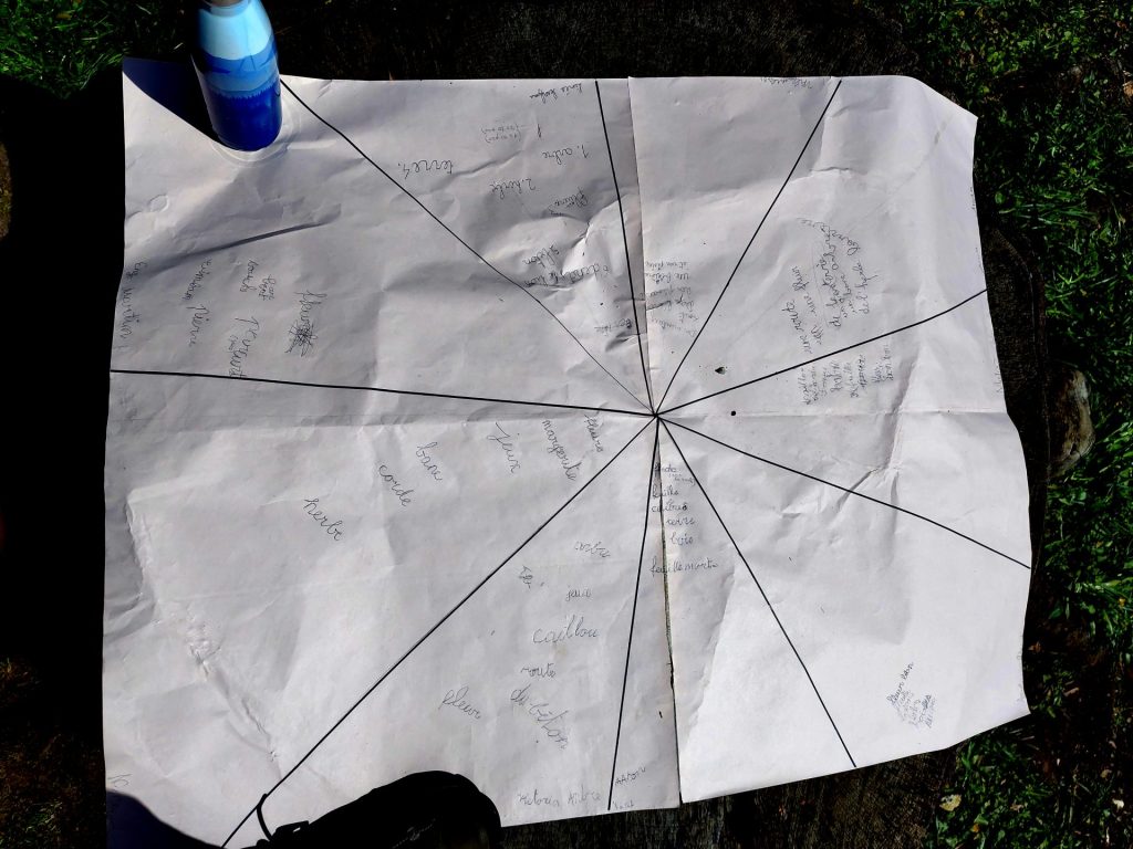 Cette carte fut très intéressante à réaliser. Non seulement c’est une vraie carte et nous allons l’utiliser dans une seconde séance pour faire découvrir à chaque groupe ce que les autres ont trouvés, mais c’est une carte de signes particuliers : des mots. Pas faciles à trouver, pas facile à écrire et pas faciles à répartir sur la carte. Nous nous y attendions et allons revenir sur le problème de la position des éléments en fonction de la distance lors de la prochaine sortie. Mais, il s’agissait d’un préalable constituant une excellente introduction à la construction de carte, une introduction qui non seulement permettra d’apprendre à lire les cartes, mais sera le préalable à la construction de cartes faites de signes autres que les mots.