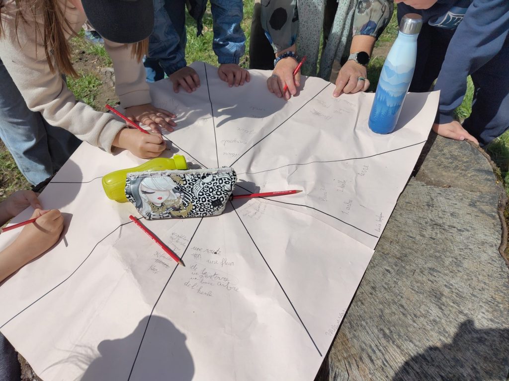 Pour chaque groupe, il faut alors découvrir un secteur en le parcourant vers l’extérieur pour y trouver six éléments du paysage (trois par élève). Puis pour chaque élément découvert, le nommer, retenir son nom, revenir le positionner au mieux sur la carte et l’écrire explicitement.