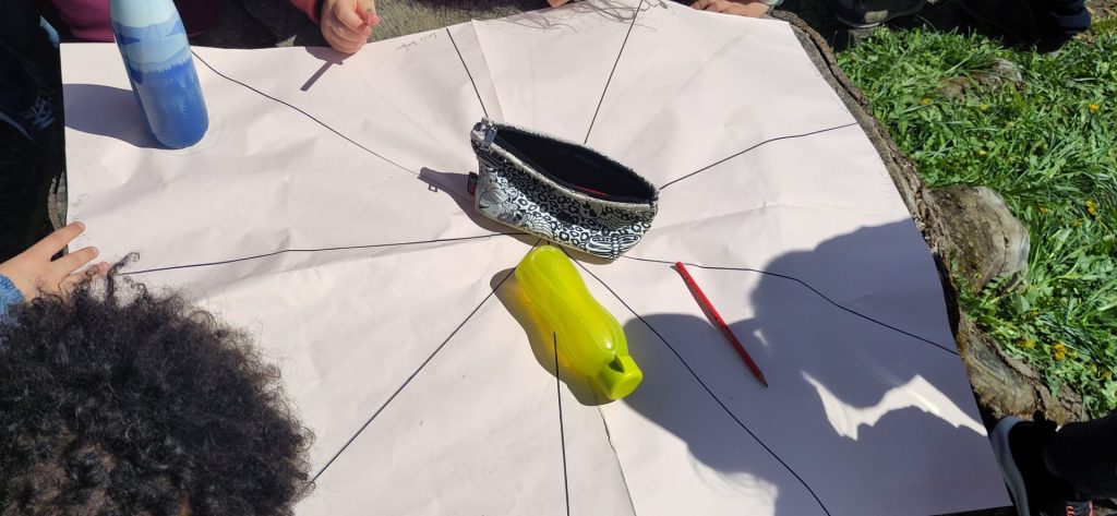 Pour aborder la notion de carte, dans un premier temps, nous avons repris une idée décrite dans l’ouvrage « L’école de la forêt » (Ulmer) où est décrite la réalisation d’une carte sectorielle. Celle-ci est découpée en autant de secteurs qu’il y a de groupes, soit pour neuf groupes de deux élèves, neuf secteurs de quarante degrés chacun.